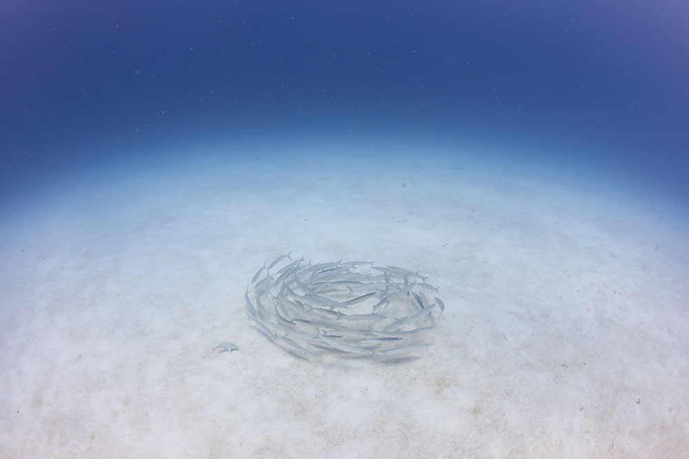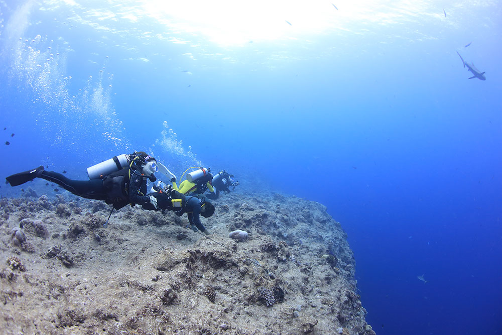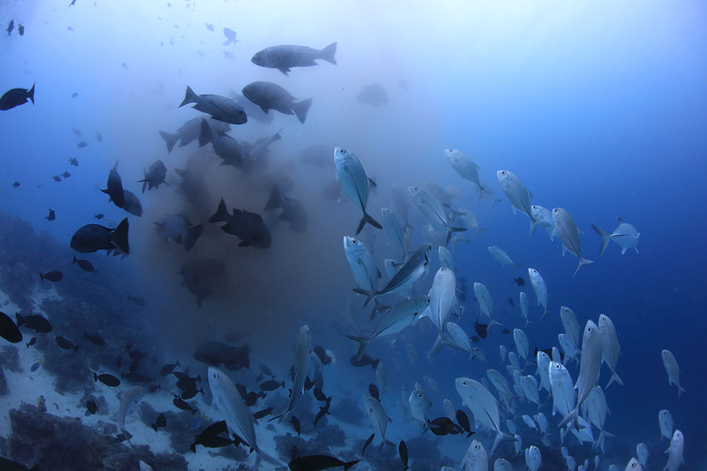 潮流によっては、ギンガメアジがドロップオフの底から湧いてくることがあるの。