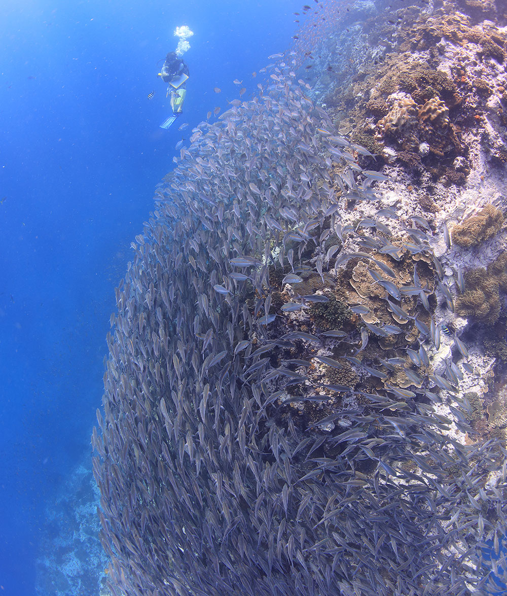 まずに人気のチュンポンピナクルの1枚!これ、めちゃタオな感じ! メアジの群れにツキチョウチョウウオにジャワラビットフィッシュにハマビラクマノミ!! 定番のスターたち!