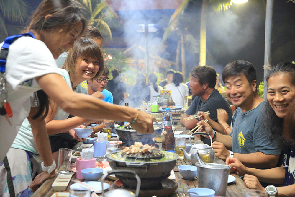 これは、ムーガタというタイ風すき焼き! うまいからみんな笑顔になるね! この笑顔は、お魚まみれの海でも一緒だったよ!!笑
