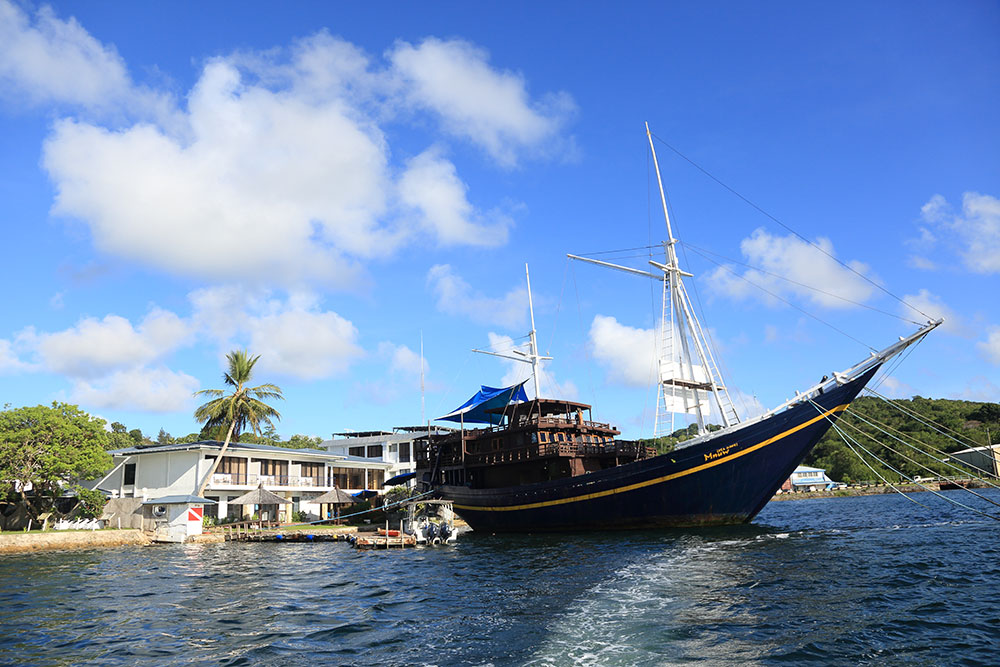 そして、マンタレイベイリゾートに戻ってきて、目印はこの帆船!(奥の建物ががホテル)