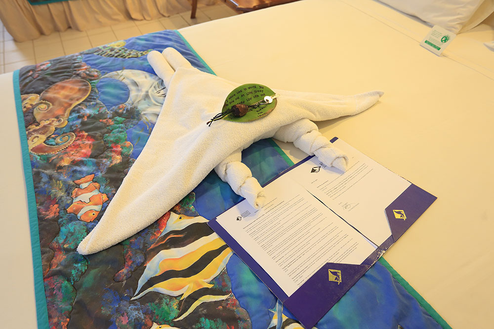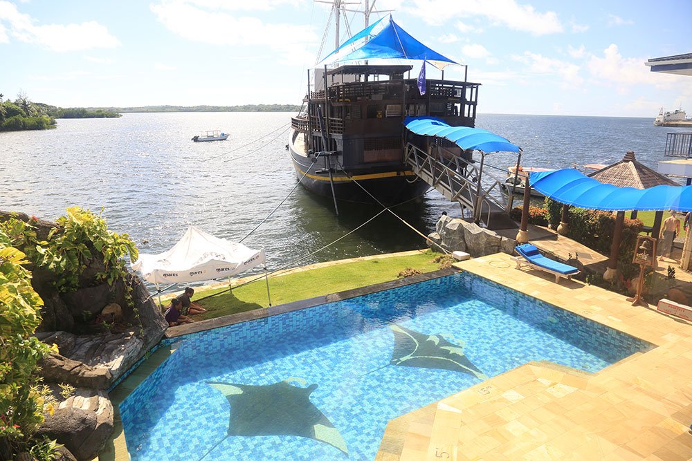 そうそう、リゾートのプールの底にもマンタが描かれていて、正直、季節の変わり目ということで(取材時期7月前半)、マンタがチャネル内をウロウロしているということで、最終日まで会えなかったの。だから、もしダメだったら、このプールで水中撮影して帰国しようか・・・と、ちょっぴり本気で考えてたわ!笑