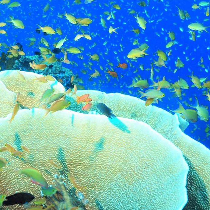 お花畑に様に広がる珊瑚に群れるカラフルなお魚たち、その景色はキラキラ光る宝石箱の様。白い砂地には変わり種のハゼも生息しており、マクロからワイドまで幅広くお楽しみ頂けます。懐深い海ににまにまが止まりません♪