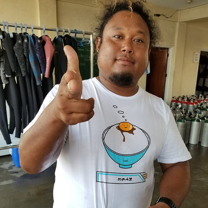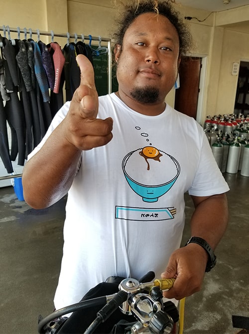 パシフッツクダイバーズで働いて13年のジェイソン、恥ずかしがりやですが実は日本語ペラペラしゃべります。ぜひ話しかけてみてください
