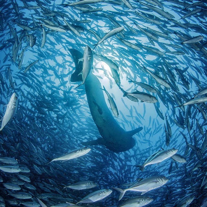 運よくそこにジンベエザメが突っ込むと・・・、写真のような思わずニマニマしちゃう状況になっちゃいます。
