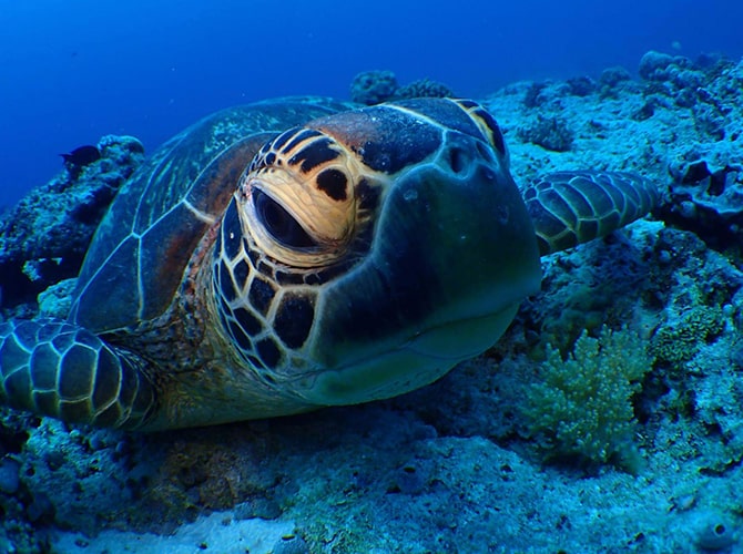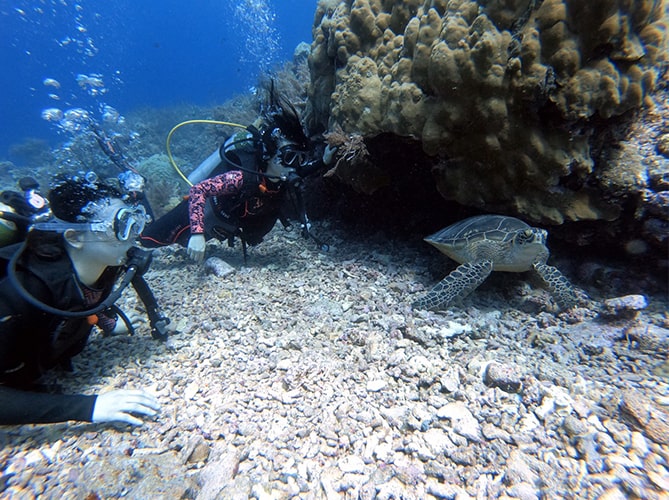 ゲメリスウォールにはウミガメ、タイマイに会える可能性大。のんびりカメさんだととても近くまで寄れることも。