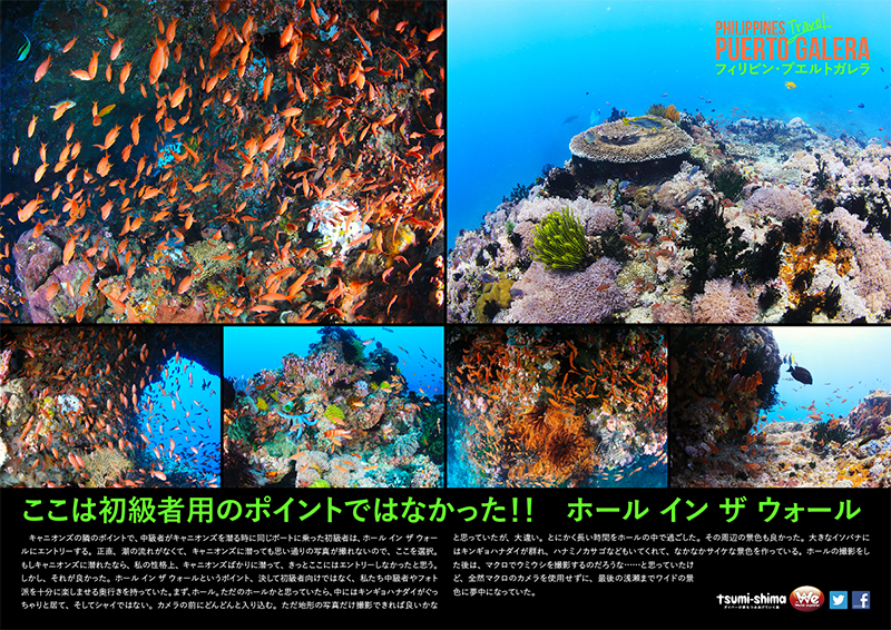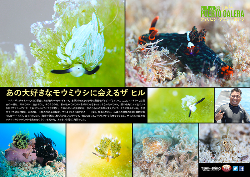 | 2日目 | 02:10 羽田空港発、(PR423)マニラへ 04:50 到着後、 バスターミナルへ 08:00 バスとボートにてプエルトガレラへ 12:30 プエルトガレラ到着 午後1ボートダイビング ※サンセットダイビングとなる場合もあります。 |