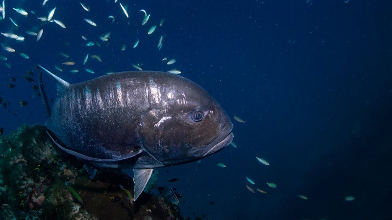 その中に突っ込んで狩りをする2m近い巨大なロウニンアジ、バラクーダやホシカイワリの群れ、