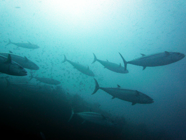 ホウセキキントキの群を下に見つつ泳いでいると大きなイソマグロ20匹の団体さんが登場。