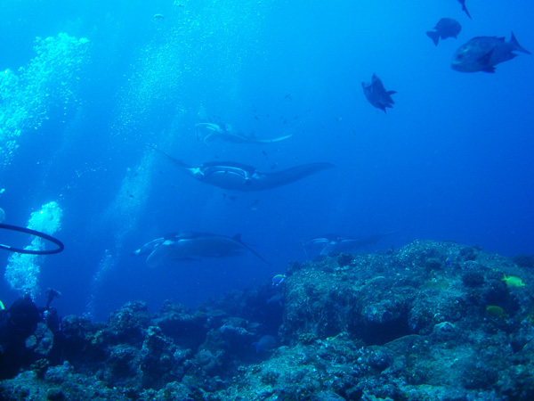ほとんど無風の穏やかな天気。さざ波も立たない鏡のような海面をドーニで進んで行くとイルカの群がチラリ、チラリと泳いで行く。クリーニングロックの側まで進むと水中のマンタがくっきりと見える。楽勝気分でエントリー。マンタを散らさないようにクリーニングロックから少し離れて潜降。もうすでに多くのダイバーに囲まれているロック。そーっと近づいて着底する。大きなマンタが4枚、入れ替わり、立ち代わりロックの上を漂って掃除してもらうマンタ達。着底してじっと見上げているゲストのすぐ真上を泳ぎ回るマンタ。ダイビングの終わりまでずっと居続けてくれた。😊