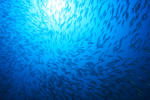 エントリーするといきなり黄色い背中のイエローバックフュージュラーが眼下を埋め尽くしている。黄色の群の中で遊んでいると群を突っ切り大きなロウニンアジがまっすぐに突っ込んでい来る。暫く進むと今度はクマザサハナムロの大群に囲まれる。朝日に青く光りながら捕食魚から逃げるクマザサの流れを堪能。ちょっと深めの斜面はキビナゴの群が踊るように、流れる雲のように激しく形を変えて泳ぎ回っている。根の上では今週もブラックフィンバラクーダが群れていた。