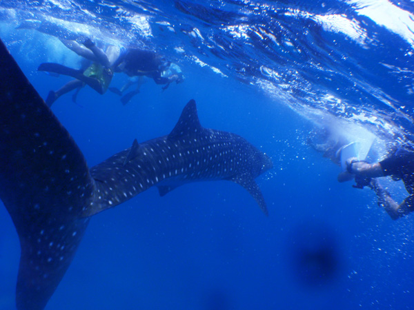 リーフ沿いに進んで行くとボートから電話で呼び戻される。また、ジンベエがボートの側で見つかった🎵現場に急行。急いで準備。今度はさっきより大きなジンベエがゆっくりと泳いでいる。浅い所をゆっくりと進んで行くジンベエは追跡も撮影も楽なもの。でも、人が固まり過ぎてあっちこっちで蹴られたり、ぶつかったりの大騒ぎ。