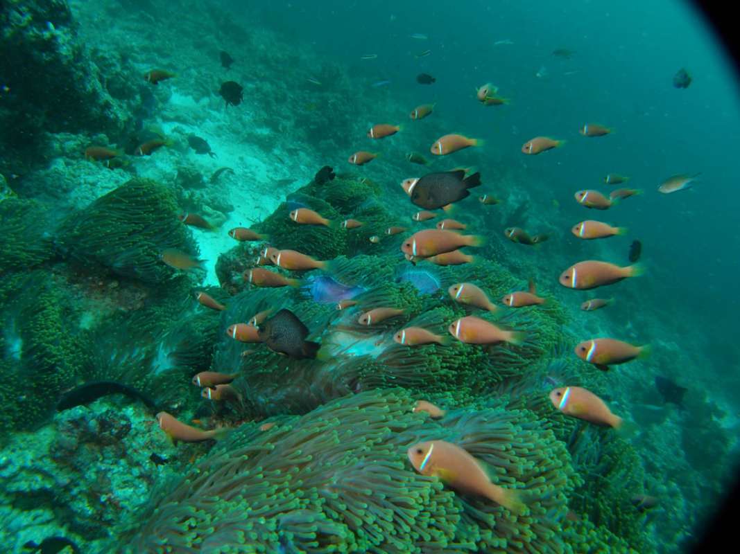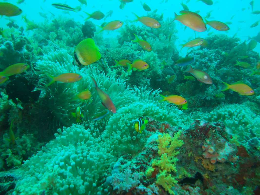 浅場にはテーブルサンゴなどのハードコーラルがびっしりあり、太陽の光が差し込んできれいで、そこにはホソフエダイ、ノコギリダイの群れやインド洋固有のチョウチョウウオなどが群れが見られました。