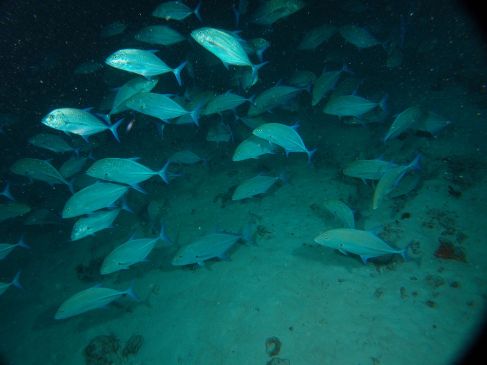 潜降すると水底付近でいきなりカスミアジ20~30匹ぐらいがギビナゴをねらってすごいアタック中でジョーフィッシュ、ドラキュラシュリンプゴビーなどのハゼたちを見ている