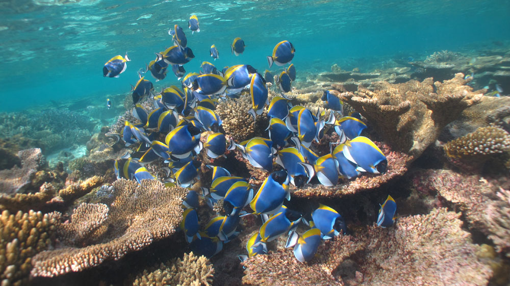 この後ラッディガー島でシュノーケリングをしました。サンゴがきれいなリーフで、パウダーブルーサージョンフィッシュ玉を狙ってみんなでさがしました。今日は、2ヶ所で結構な群れを見ることができました。