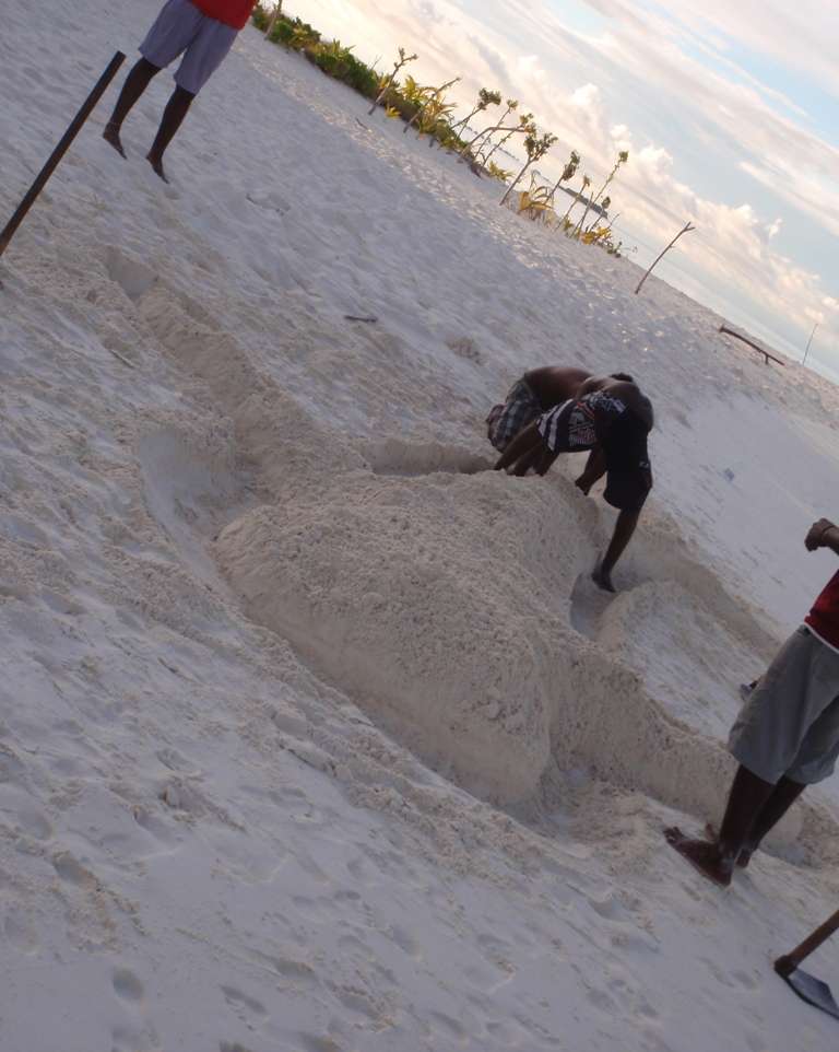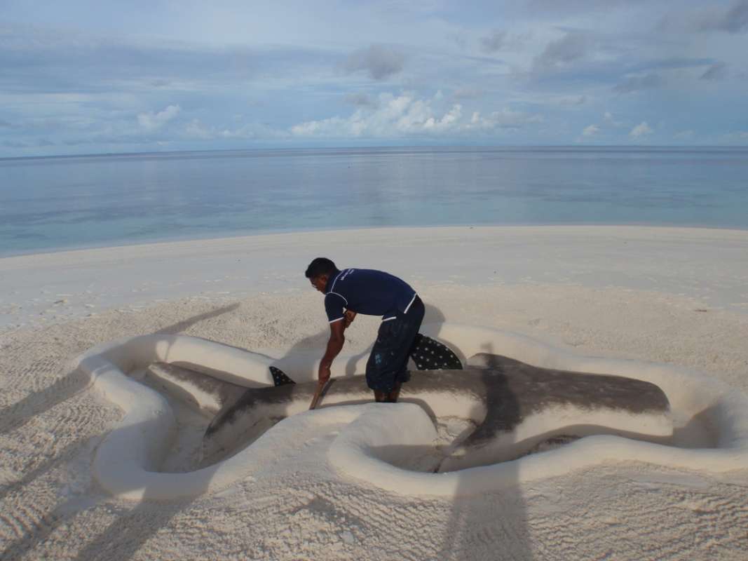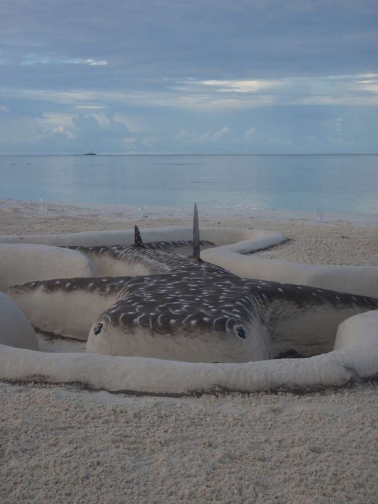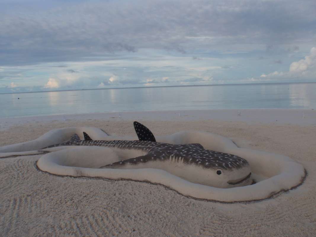 このジンベエさん、ビーチバレーボール大会を開始する前に、働き者のクルーが一生懸命作ってくれてんです。