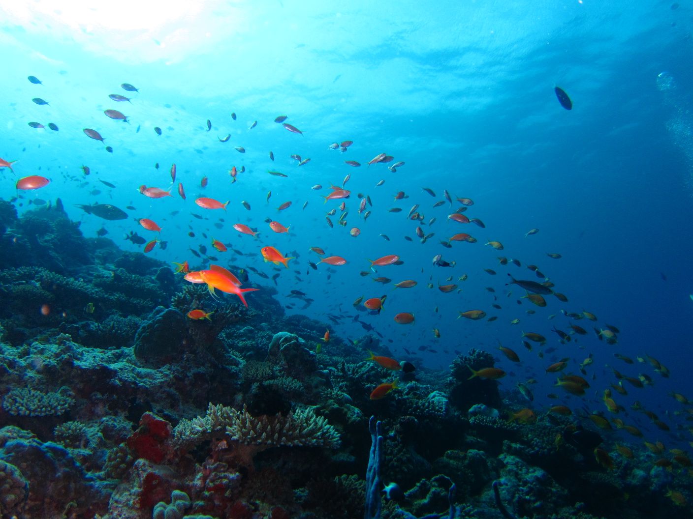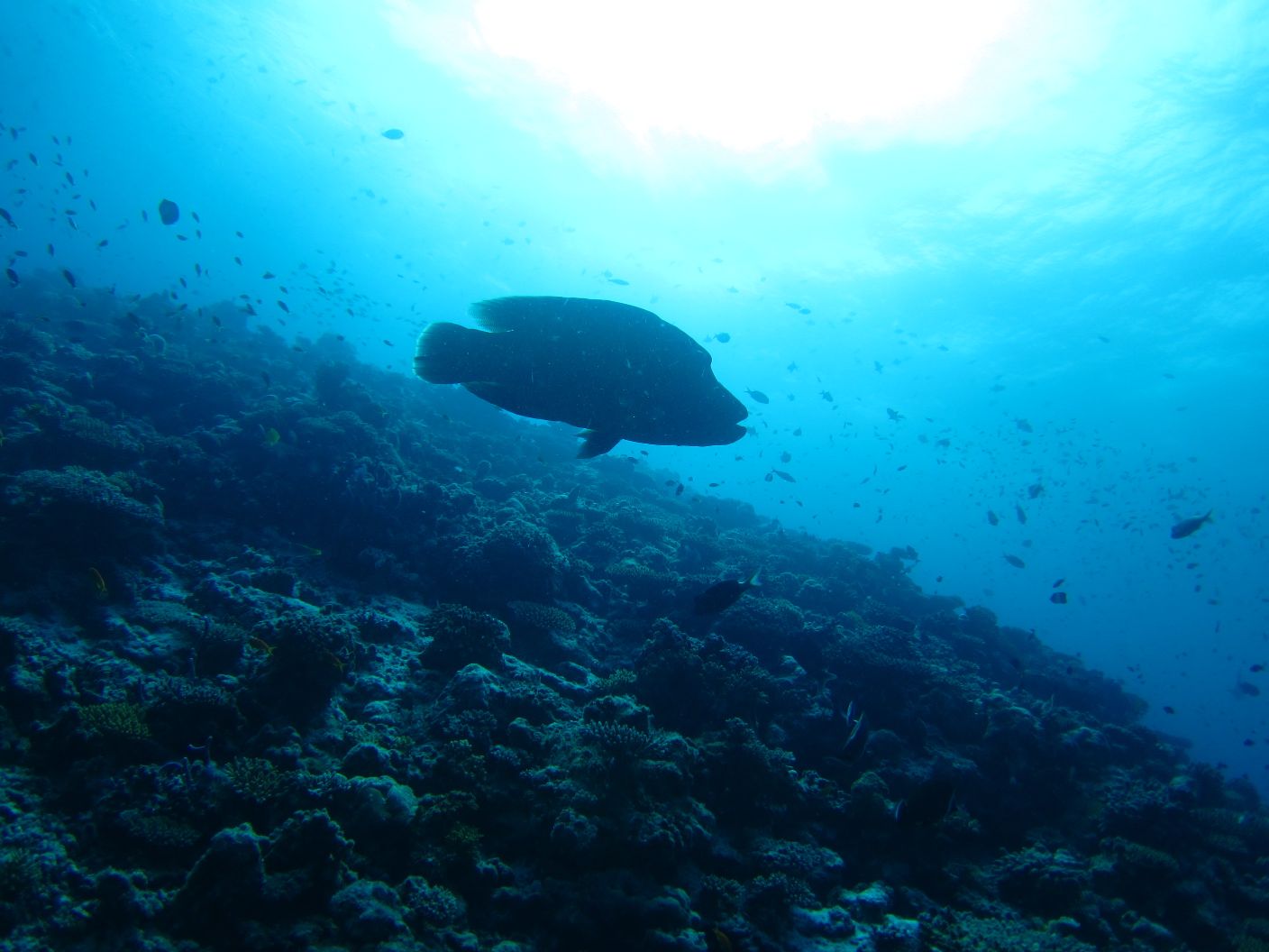 下にいるのはガイド2名。ゲストはおよそ10m上をおよいでいるのですが透明度悪くてこれ以上は離れるの心配。。