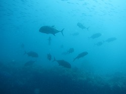 見られた生物:バラクーダ・ギンガメアジ・カスミアジ・ロウニンアジ・ツバメウオ・ヨスジフエダイ・ベンガルスナッパー・グレイリーフシャーク・タイマイ