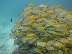 見られた生物:ヨスジフエダイ・マダラエイ・ヒメフエダイ・カスミアジ・ナポレオンフィッシュ・モルディブアネモネフィッシュ・クマザサハナムロ・イソマグロ