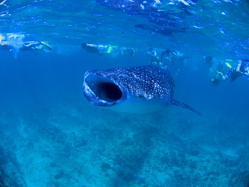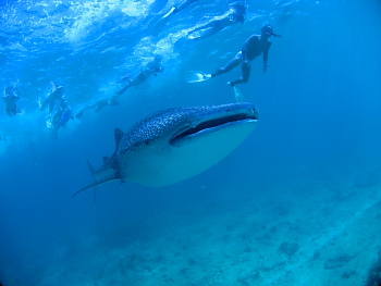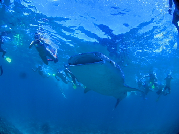 みんなで飛び込むと、5m級のジンベエが背中を水面に出しながら泳いできます。