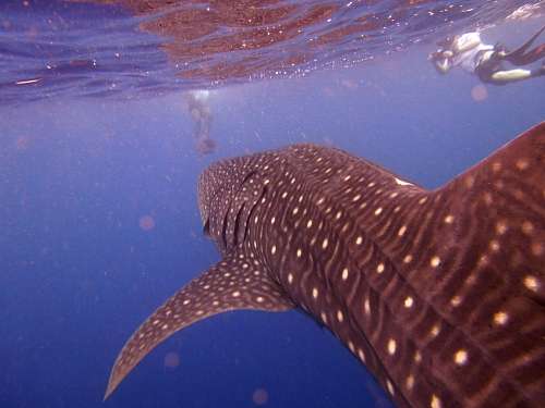 7M級のジンベエザメが水面下をゆっくり泳いでいます。