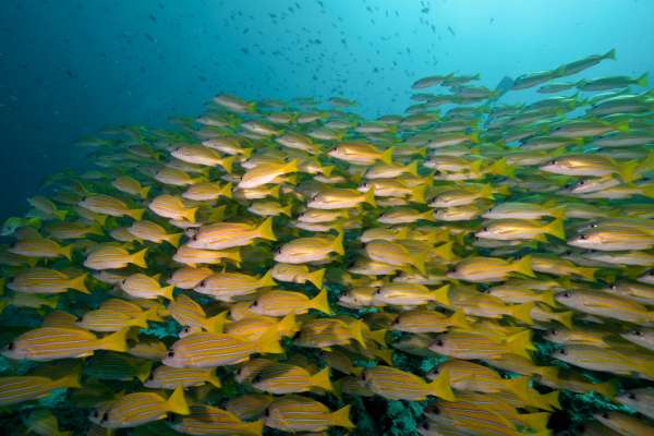 流れの上では、マダラトビエイ・ギンガメアジ・バラフエダイ・マダラタルミ・ロウニンアジが大きな群をつくります。