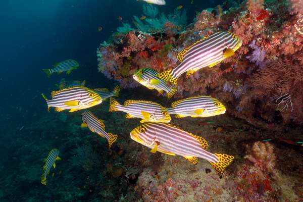 リーフのいたるエリアで、コラーレバタフライの塊・ムスジコショウダイの群を見られます。