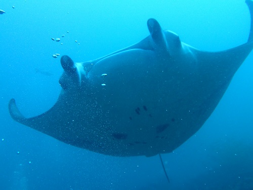 この日の最後はマンタポイント!!流れは弱くマッタリ泳いでいると正面から一枚スーッとマンタが過ぎていきました。
