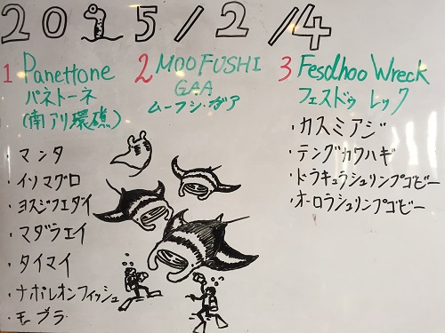 マンタ、イソマグロ、ヨスジフエダイ、マダラエイ、タイマイ、ナポレオンフィシュ、モブラ