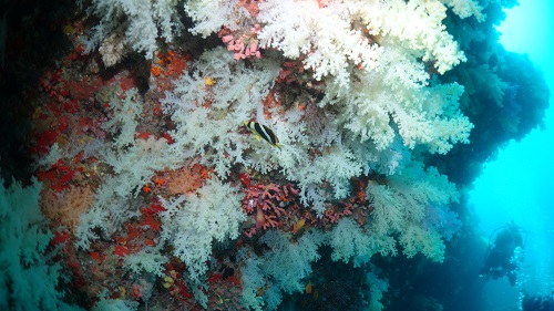 数々のオーバーハングやケーブがあり、その中にある色とりどりのソフトコーラルがとても美しいポイントでした!