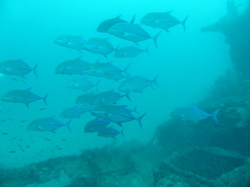 ハニーコームモレイ、グレーリーフシャーク(多数)、カッポレ、サドルバッグバタフライ、ロウニンアジ
