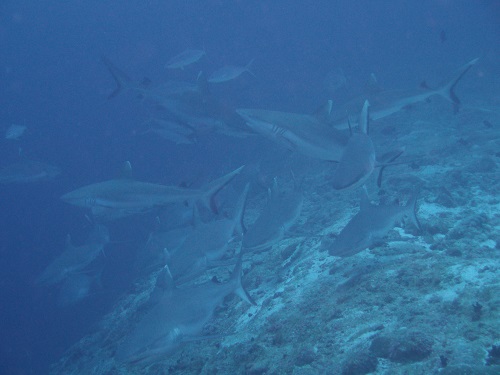 二本目は南マーレ環礁からフェリドゥ環礁に移動、コーナー付近にぞろぞろとサメが出現!