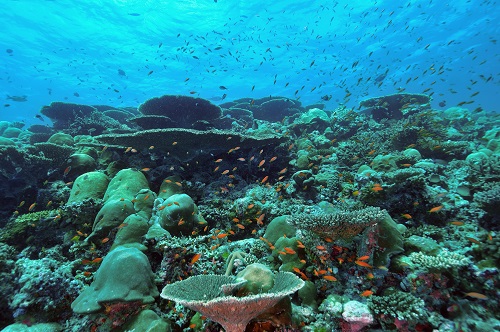 クッドゥー島の南側のコーナーでダイブ、チャネル内はコーラルブロックが点在し、流されながらサンゴ鑑賞!
