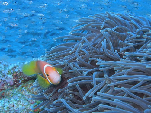 ガーフ環礁内にあるボードゥー島のハウスリーフで四本目!サンゴがびっしりありそこに数え切れない位のスカシテンジクダイが群れていました!