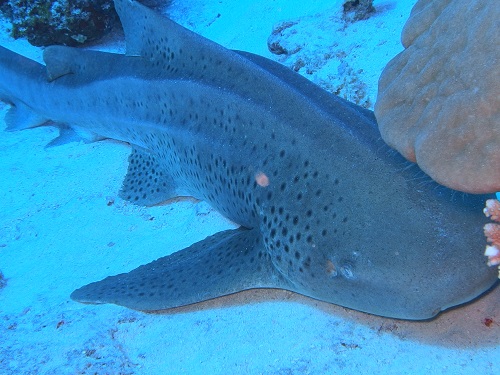 ニランドゥ島の北側のコーナーで最終ダイブ!コーナー付近は激流でチャネル内のリーフはサンゴが沢山!目を凝らして良く見るとレオパードシャークが寝てました…zZ