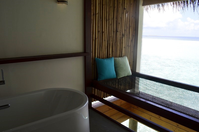 なんと水上ヴィラのバスルームにハンモックがあるという新しい作り!!