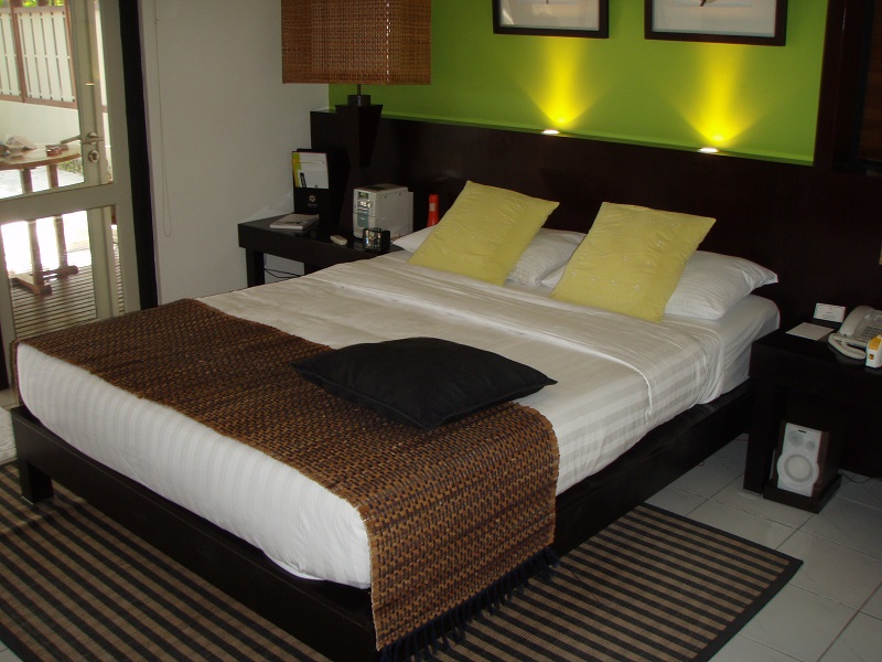 25室/47平方メートル。外観はヤシぶきの屋根、オンドーリ付のデッキなど、素朴でモルディブらしさを感じるが、室内へ入ると一新、ポップで遊び心溢れるお部屋が何だか楽しい気持ちにさせる。