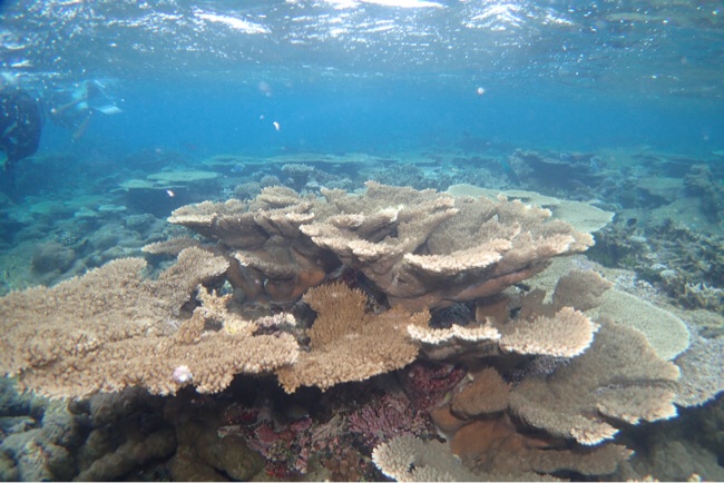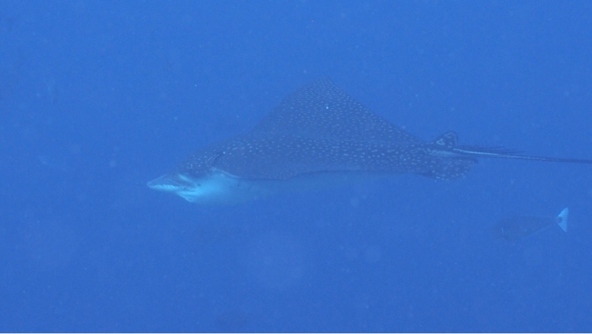 3本目は南マーレ環礁に戻りヴェラッサルケーブス。深い所にオーバーハングが多くソフトコーラルが綺麗な所が何箇所かあります。リーフトップのテーブルサンゴが綺麗です。沖側にはマダラトビエイが泳いでました。