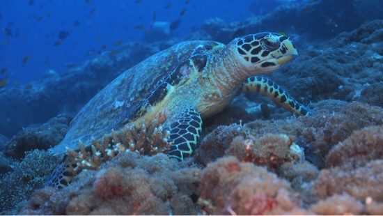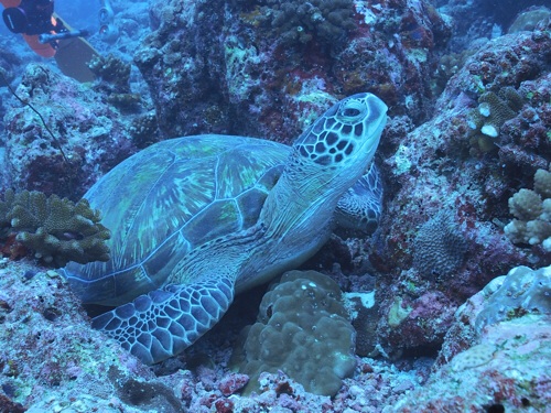 モルディブアネモネフィッシュ、ヨスジフエダイ、ムスジコショウダイ、バラフエダイ、チョウチョウコショウダイ、イエローバックフュージュラー、アオウミガメ