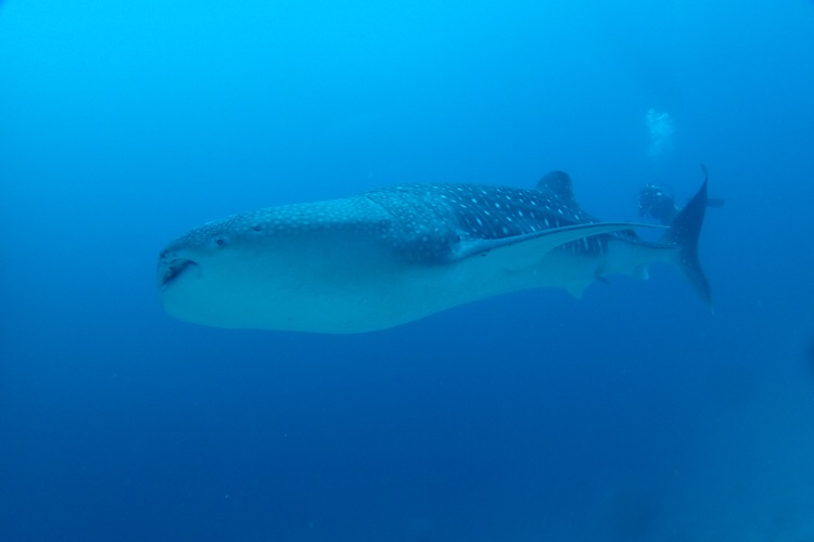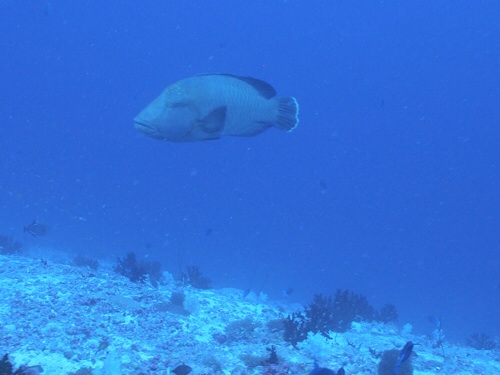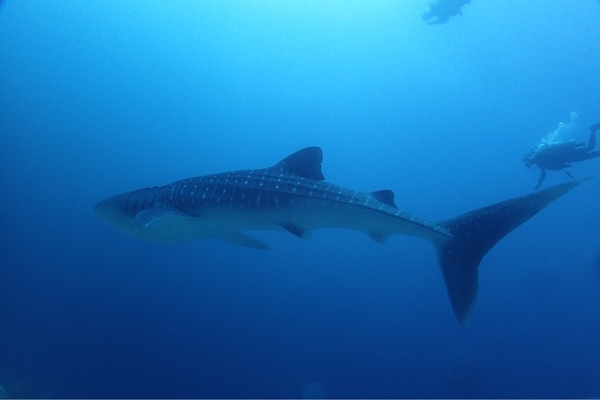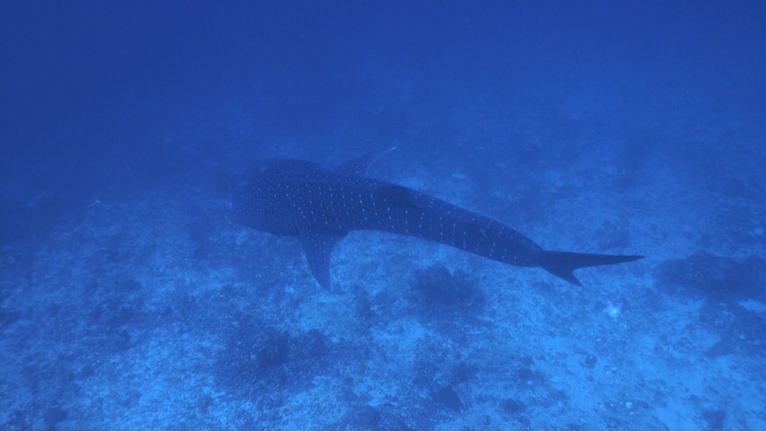 ラストチャンスでジンベエサーチ。ダイビングボートでジンベエを探し、20分位走った所で他の船がジンベエをみつけていたのでそこでエントリーをしました。潜ってジンベエが来るのを待っていて現れたのが23-4m位で泳ぐのがあまり速くない個体だったのでゆっくりみれました。最後は深い方に行ってしまい、また全チームでジンベエを探していると次はリーフトップに中型のジンベエがいました。ダッシュしたのですが後ろ姿をみるのがやっとでした。