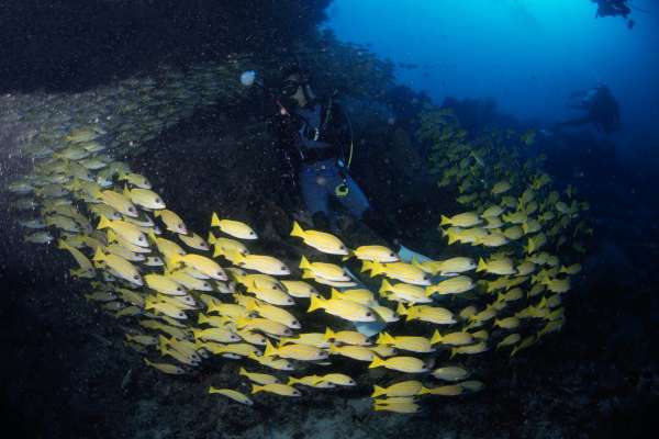 見られた生き物: バラクーダ群 ギンガメアジ群 グレイリーフシャーク ホワイトチップシャーク ツバメウオ群 ロウニンアジ カスミアジ イソマグロ イエローバックフュージュラー多 クマザサハナムロ多 モルディブアネモネフィッシュのコロニー
