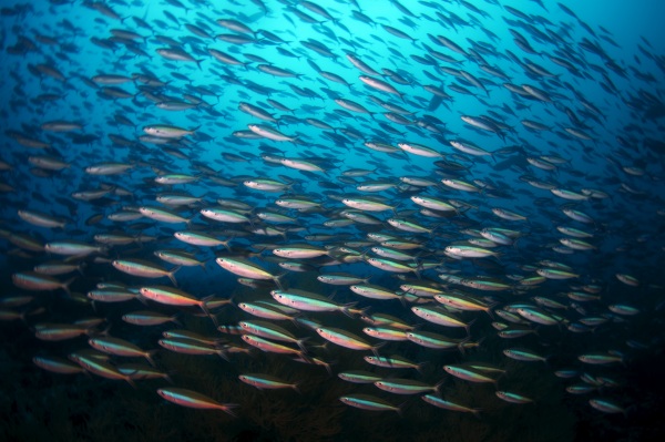 ほどよい潮が外洋から入り、そこに流れてくるプランクトンを補食するため物凄い数のクマザサハナムロたちが集まります。