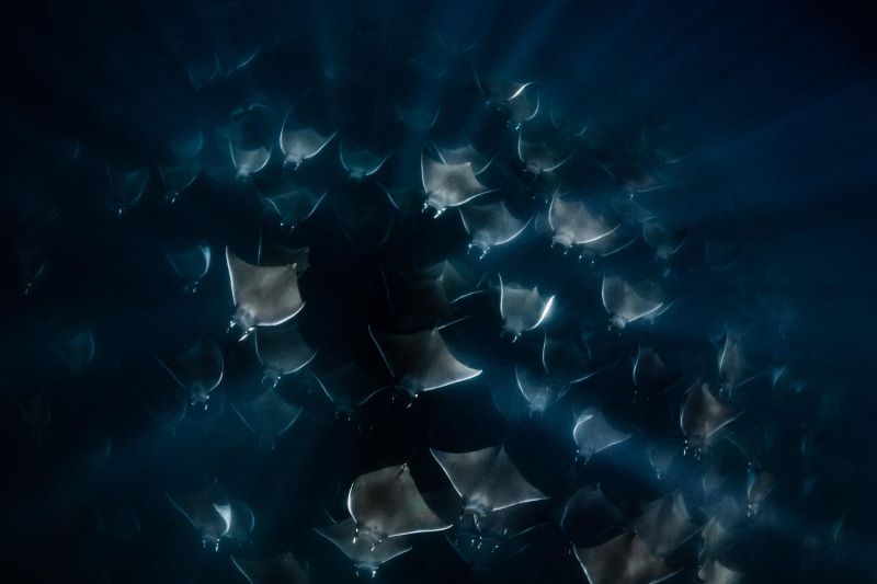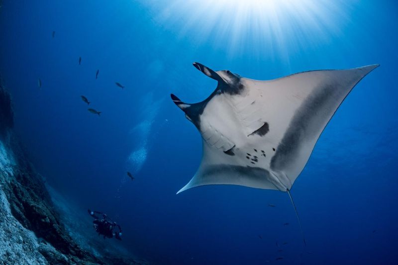 モビュラはトビエイの仲間で、翼のようなヒレを広げて泳ぐ美しいエイです。