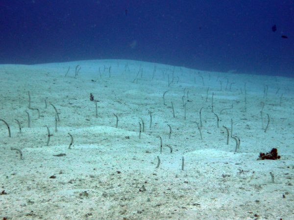 気持ちよく流れされていると綺麗な砂地が広がっています。 そこには元気なガーデンイールが、