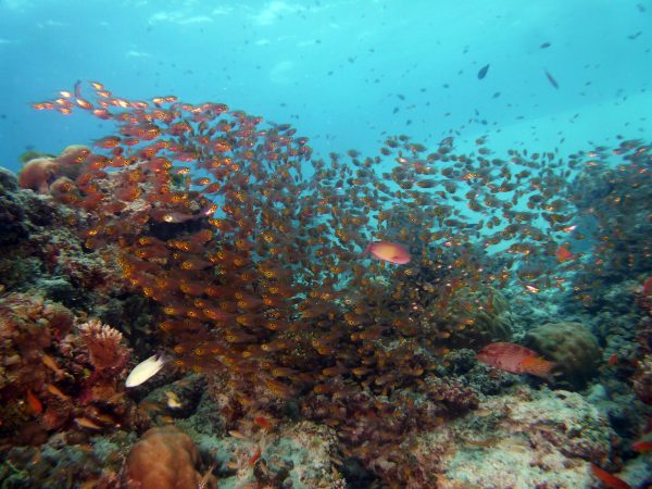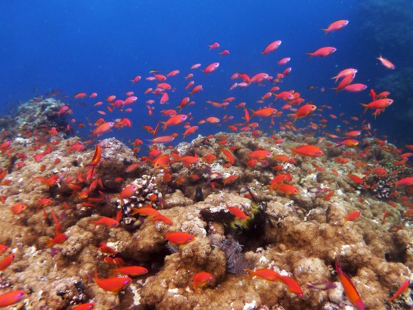 近くのサンゴにはキンメモドキが集まっていて、
