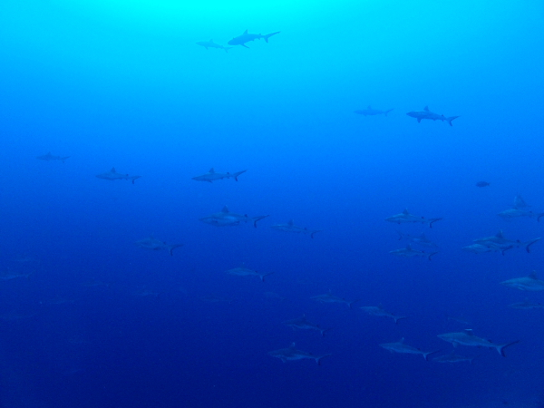 ハンマー、カジキ、トビエイの編隊、メジロザメの群、ナイトシャーク、そしてジンベエザメと、大物が次々登場で大忙し!!