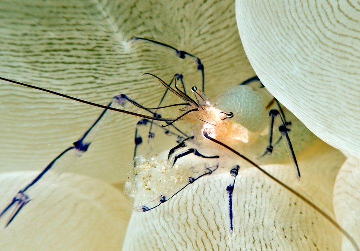 8. 「こんな細かい部分をとらえた写真は今までに見たことがありませんでした。バブルコーラルシュリンプが何をしているのか、仲間と長い議論になりました。卵のようにも見えますが、違います。シュリンプの一部の様にも見えますが、ミズタマサンゴ(バブルコーラル)の欠片で、エビがそれを食べているというのが最終的な結論です。あなたは、どう思いますか?」